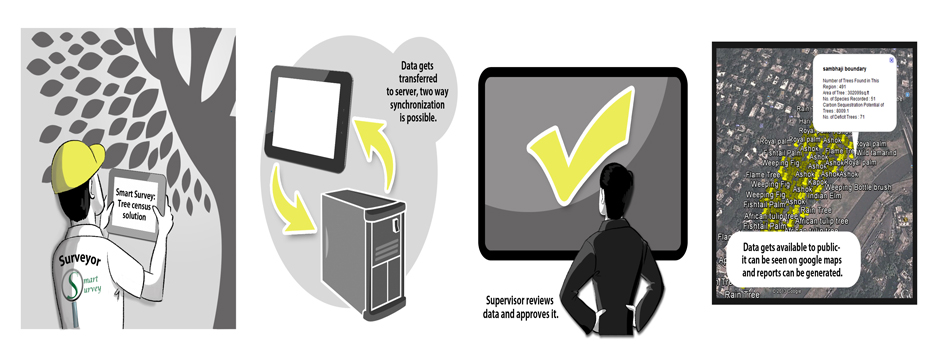 Supervisor logs in to web application and goes through the tree survey records done by surveyor, he approves/rejects the entries. On approval data gets inserted into actual database which can be seen by anyone. |